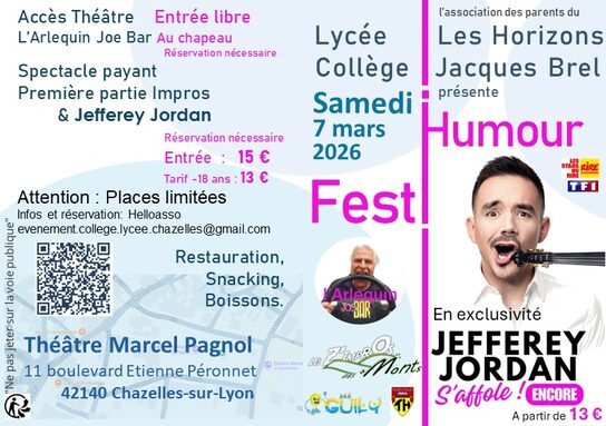 Par Sandrine Brun, publié le lundi 9 février 2026 10:20 - Mis à jour le lundi 9 février 2026 10:20Soirée Festi Humour organisée par le conseil local du Collège Jacques Brel et du Lycée Des Horizons pour aider au financement des sorties scolaires des élèves. Vous trouverez le programme en pièce jointe. -